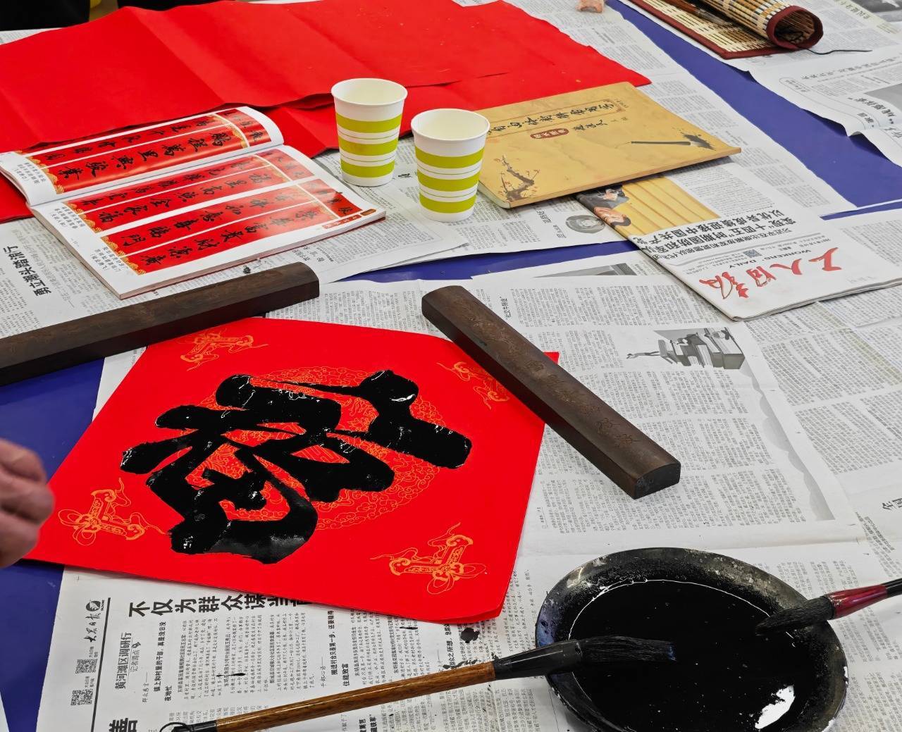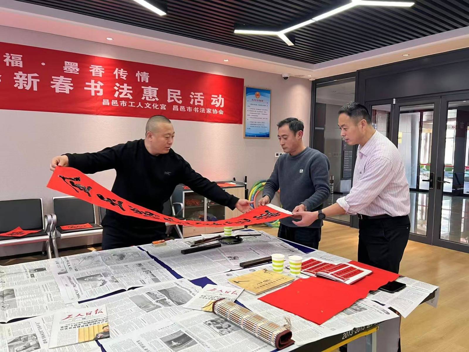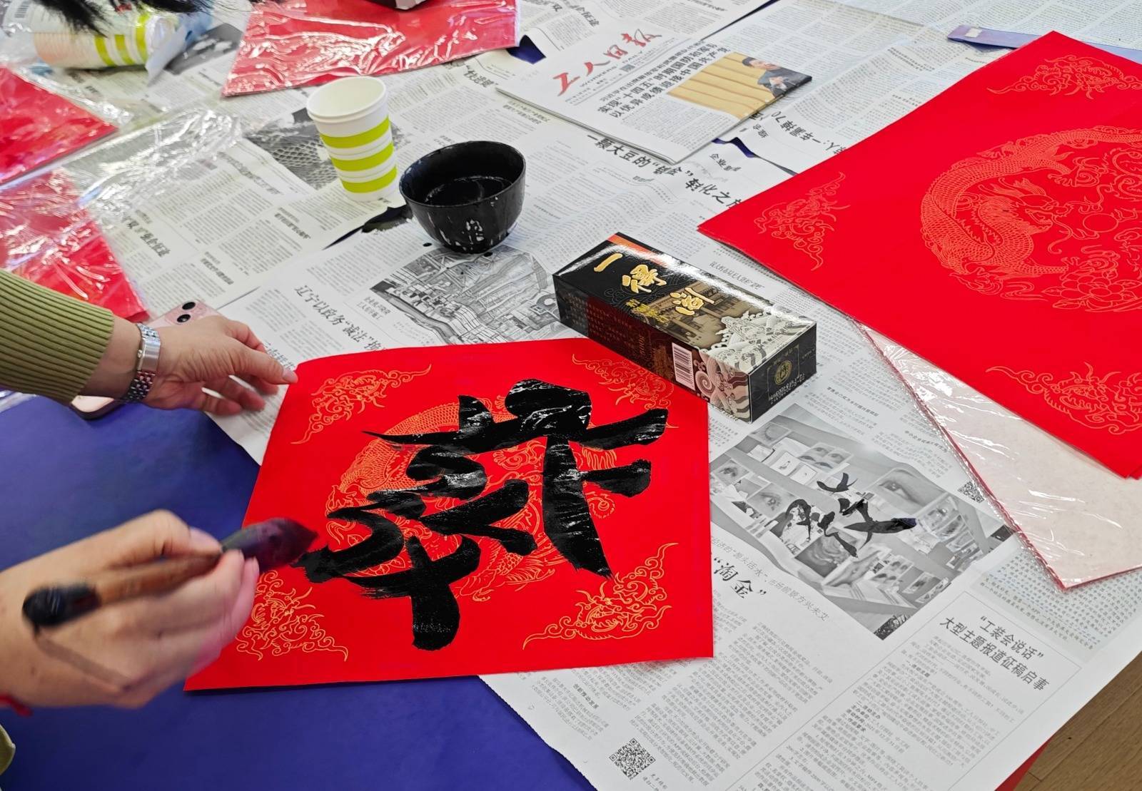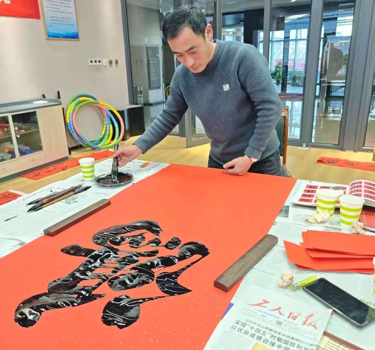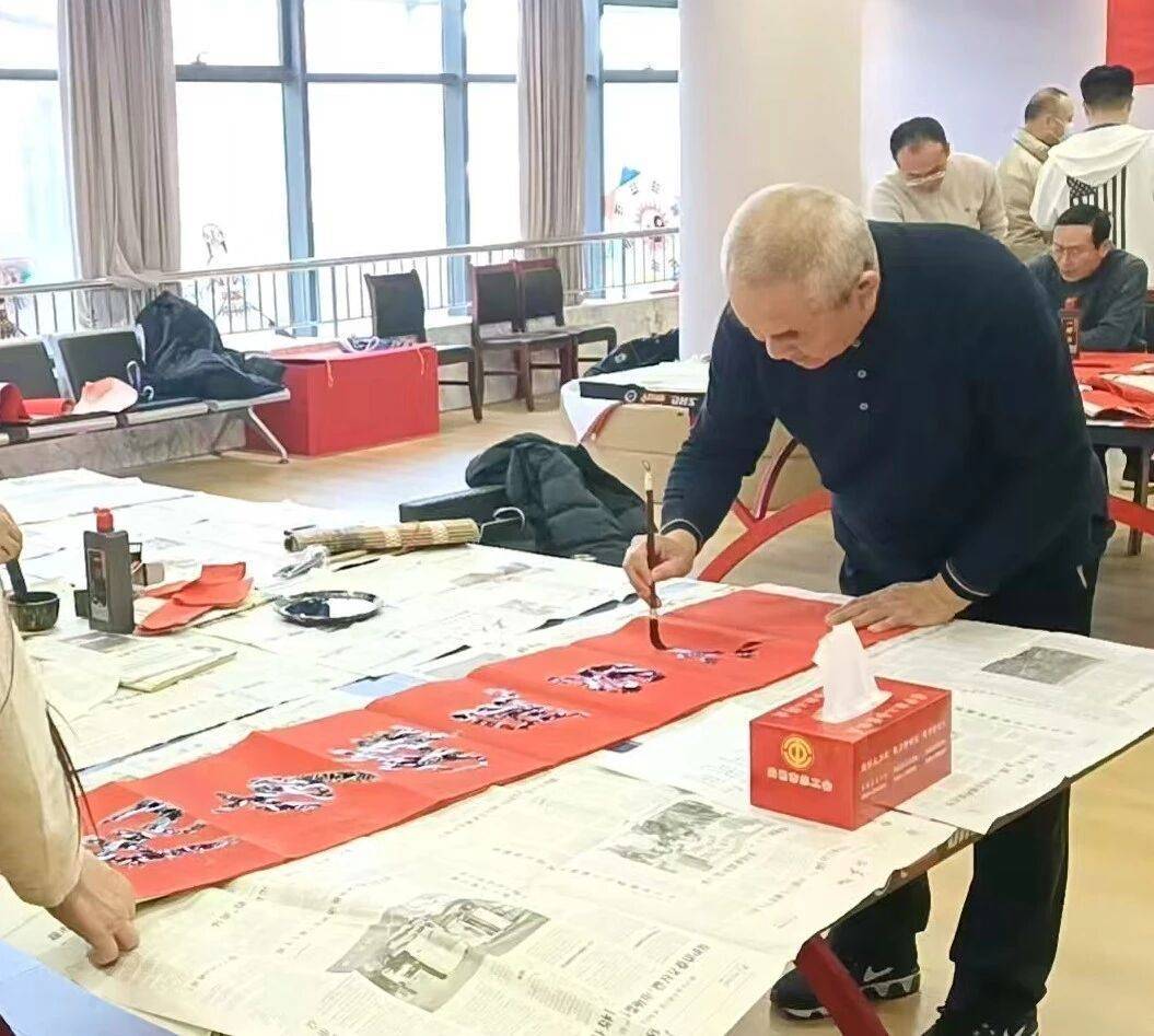 r走进工东说念主文化宫行径现场,一股浅浅的墨香当面而来。红纸铺开,笔尖蘸墨,书道家们凝想聚气,挥毫泼墨,一系列作为哄骗自如。