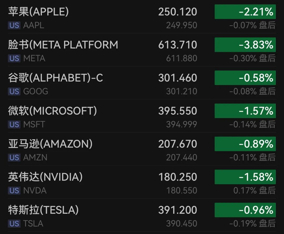 英伟达跌1.58%,特斯拉跌0.96%,博通跌4.11%,微软跌1.57%,亚马逊跌0.89%,谷歌-A跌0.42%,谷歌-C跌0.58%,超威半导体跌2.20%。