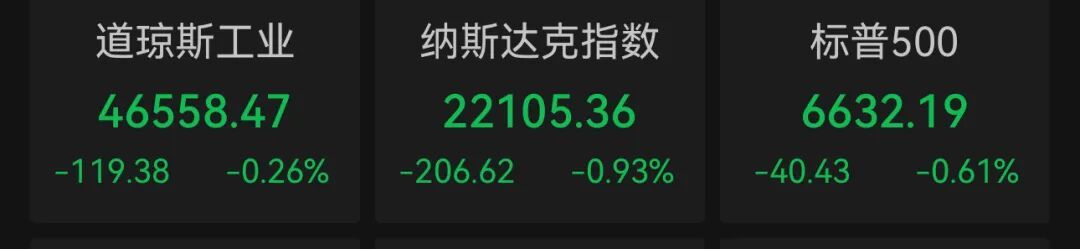 甘休收盘,谈琼斯工业平均指数着落119.38点,收于46558.47点,跌幅为0.26%;标普500指数着落40.43点,收于6632.19点,跌幅为0.61%;纳斯达克详尽指数着落206.62点,收于22105.36点,跌幅为0.93%。罗素2000袖珍股指数着落8.94点,跌幅0.36%,报2480.05点,收于年内低点。
