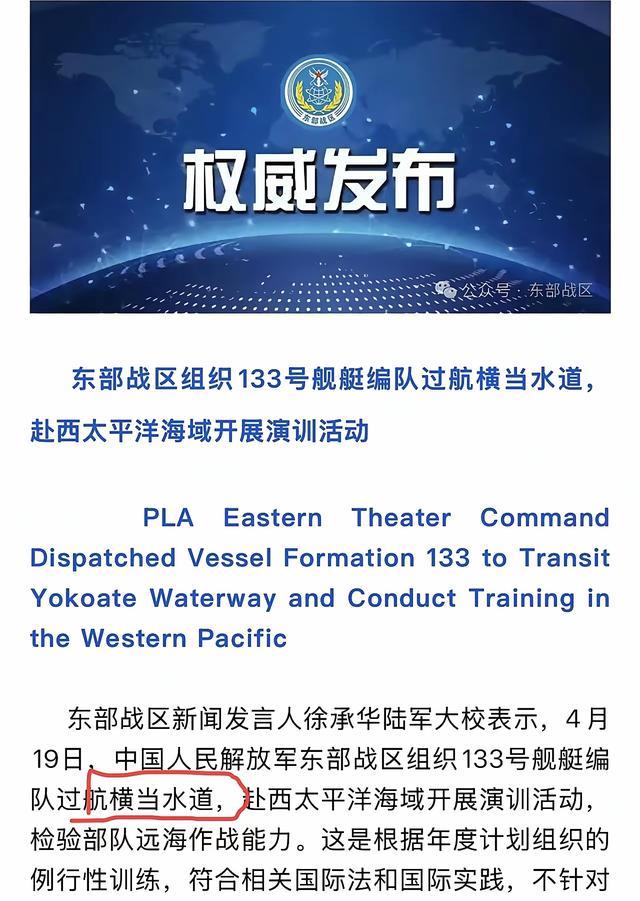 4月19日,东部战区晓谕:133号舰艇编队过航横当水说念,赴西太平洋演训。