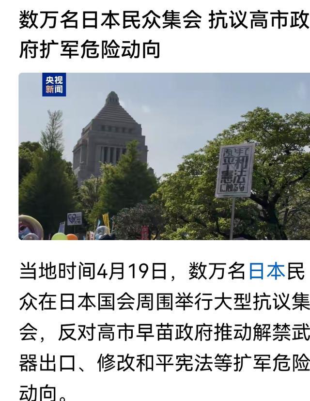 其次是人人层面。4月19日,数万日本人人在国会周围聚合,反对高市早苗政府扩军。口号上写着:“日本不成成为圆寂商东说念主”“不要战争首相”。日本人人不傻,他们看得很了了:政府债务率229.6%,物价飞涨,工资不涨,政府却把9万亿日元拿去搞武备。当今好了,寻衅中国的适度是什么?是中国艨艟开到我方家门口了。